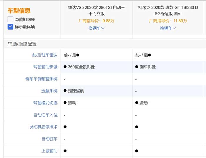 选择上述两款车型进行比较,它们都可以提供的配置包括主/副驾驶座安全气囊、前排侧气囊、前/后排头部气囊、胎压报警、ESP车身稳定控制系统、后驻车雷达、倒车影像、发动机启停、上坡辅助、电动天窗、铝合金轮毂、车顶行李架、多功能方向盘、行车电脑、中控彩色液晶触控屏幕、手机互联/映射、语音识别控制系统、LED日间行车灯等。