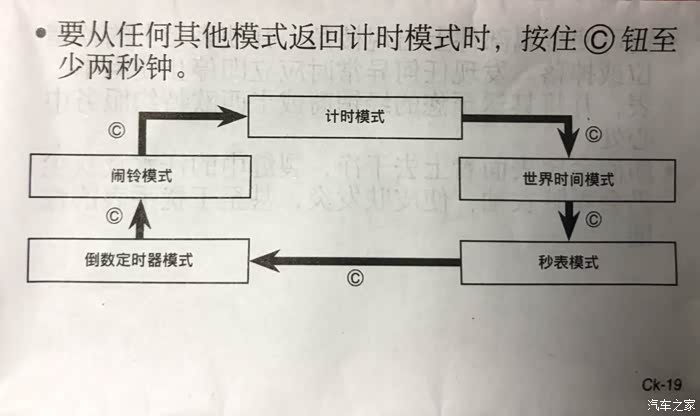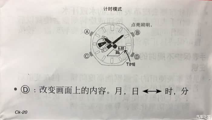所谓“计时模式”就是常规的标准显示,包含日期、时、分、秒、星期等信息。为了使说明书通俗易懂,官方将手表的按键命名为A\B\C\D,虽然有所帮助,但仍然难理解其操作方法,为此我立帖解答。