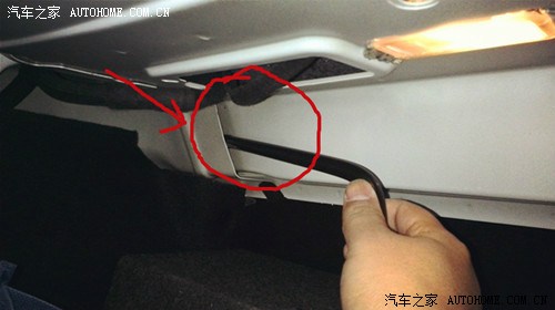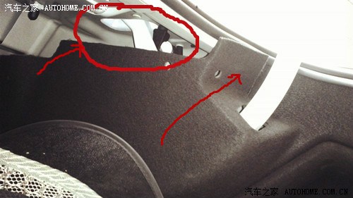 5、将后备箱拉杆让4S免费换掉,红圈所圈地方,以及固定后备箱侧边毛毡的塑料件拆掉(箭头所指位置)可异响依旧