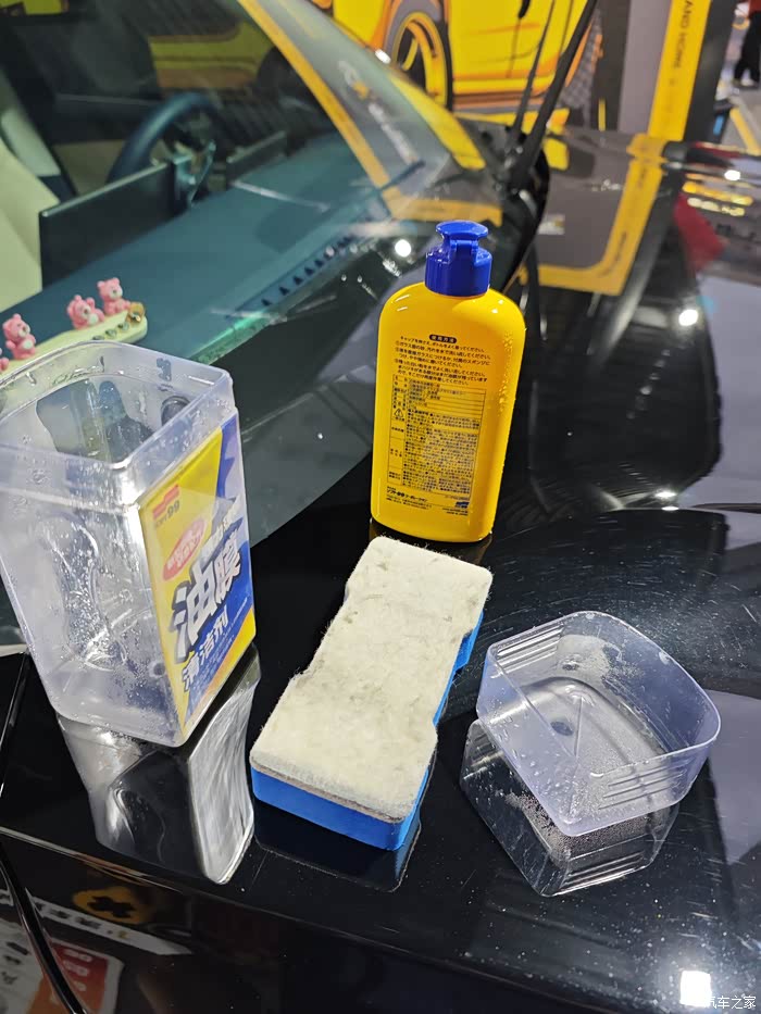 ·油膜清洁剂挤于湿润海绵,以同心圆轨迹反复打磨玻璃