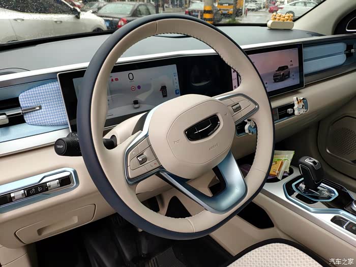 内饰方面,10.25英寸全液晶仪表和12.3英寸中控大屏的组合科技感满满,搭载的吉利银河OS系统反应流畅,支持智能语音控制、高德导航。不过需要吐槽的是,车机系统在切换主题时偶尔会有轻微卡顿了。