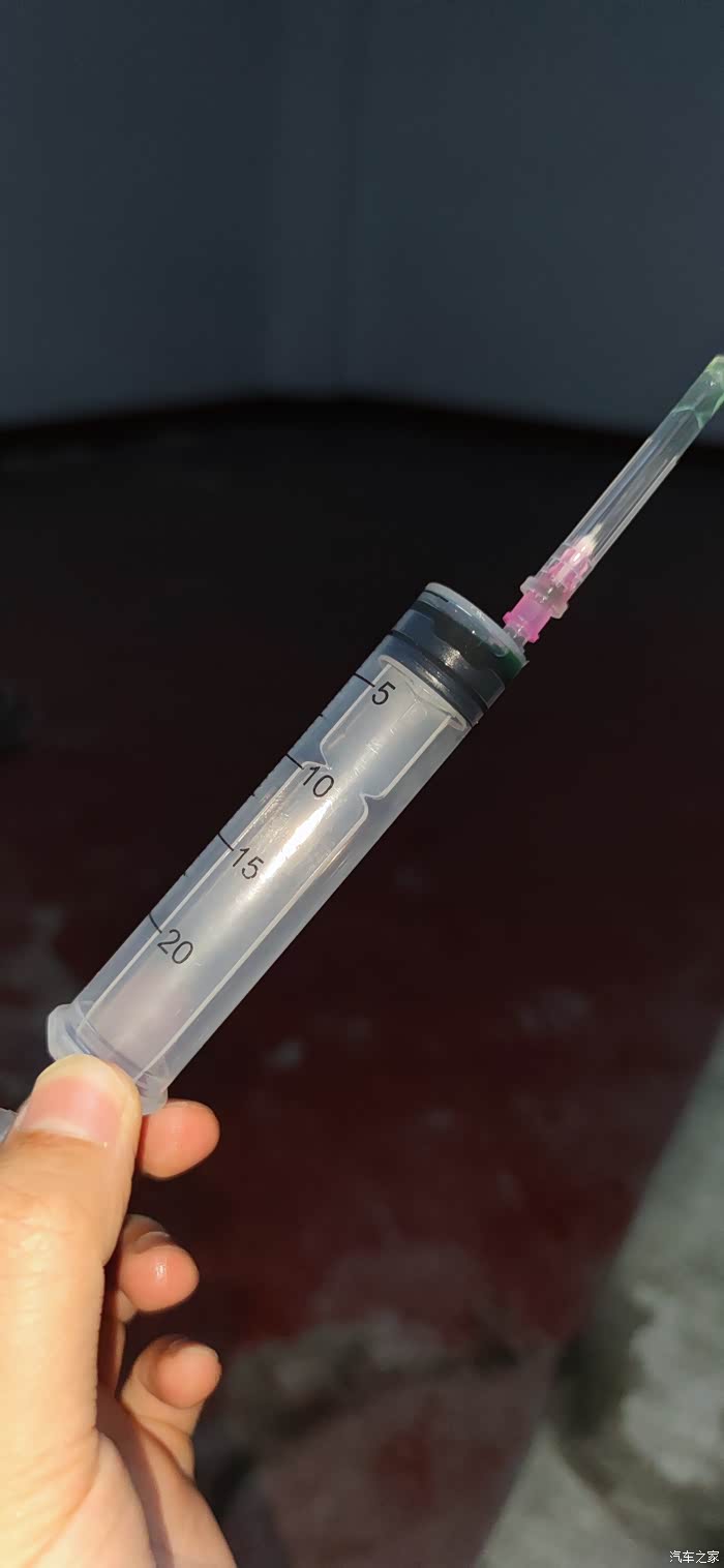1、使用注射器从阀体油瓶中抽出一管,呈绿色液体,戴上针头,慢慢注射到黑色的阀体油管路中。