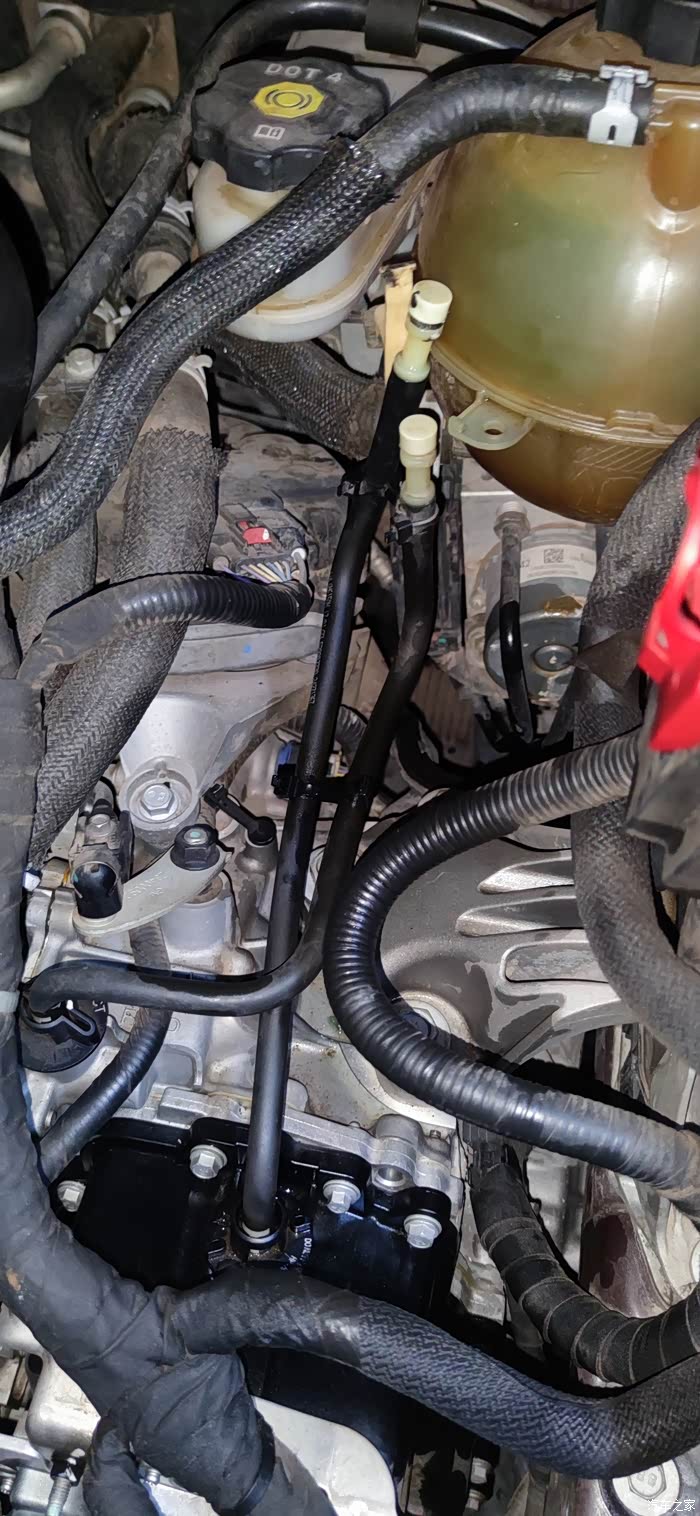 1、打开机舱,找到变速箱,在变速箱头部有个黑色模块和一个机电单元,黑色模块就是阀体,在阀体上有一根油管伸出(变速箱也有一根油管伸出),两根油管并列绑定在冷却壶旁边,找准阀体油管路。