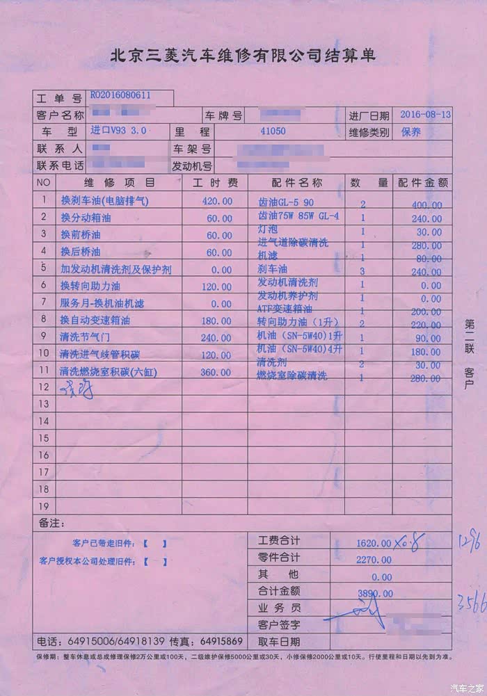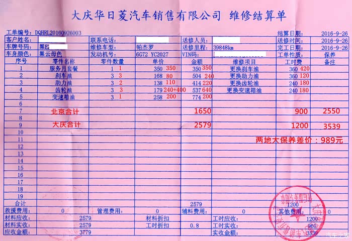 这是敝人大保养的项目及费用,图中红色小字的是北京车友的保养项目的价格。