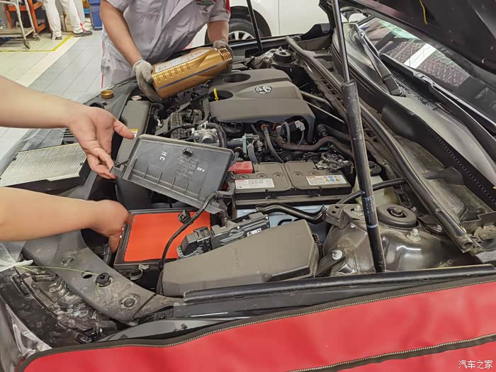 师傅现在已经去给我更换机油了,因为跑了小万把公里了,然后机油的话完全已经发黑了。汽油放了半天才放完,然后给车注入新的机油。放了一大瓶外带一小瓶才把里面的汽油注满。在这个时候另一个师傅也在去给车做一些检查,像是里面的全车的液体,玻璃水,刹车液防冻液什么的,发现如果说有不足的话,他会给你补满。