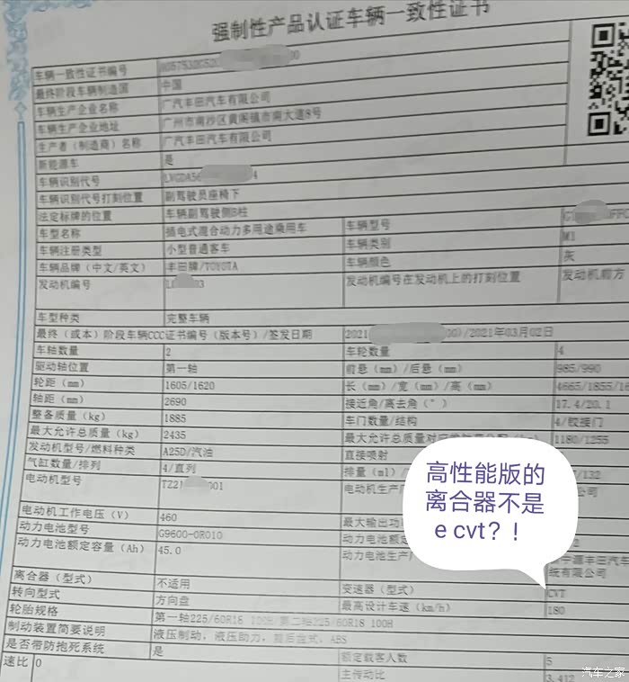 提车,发现合格证上威兰达高性能版(插电)的变速器是CVT(钢带传动)的,各汽车平台宣传是ECVT(行星齿轮传动)。求证。