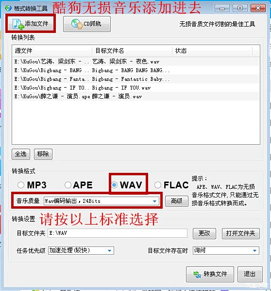 三,打开格式转换,添加文件-把刚才下载的无损音质的歌曲文件添加进去,下面红色标注的请按标准选择。需要转换为WAV格式音乐。