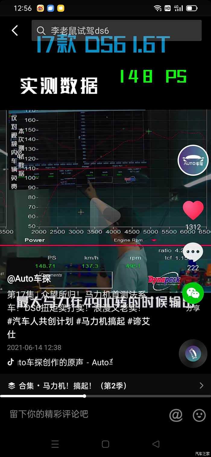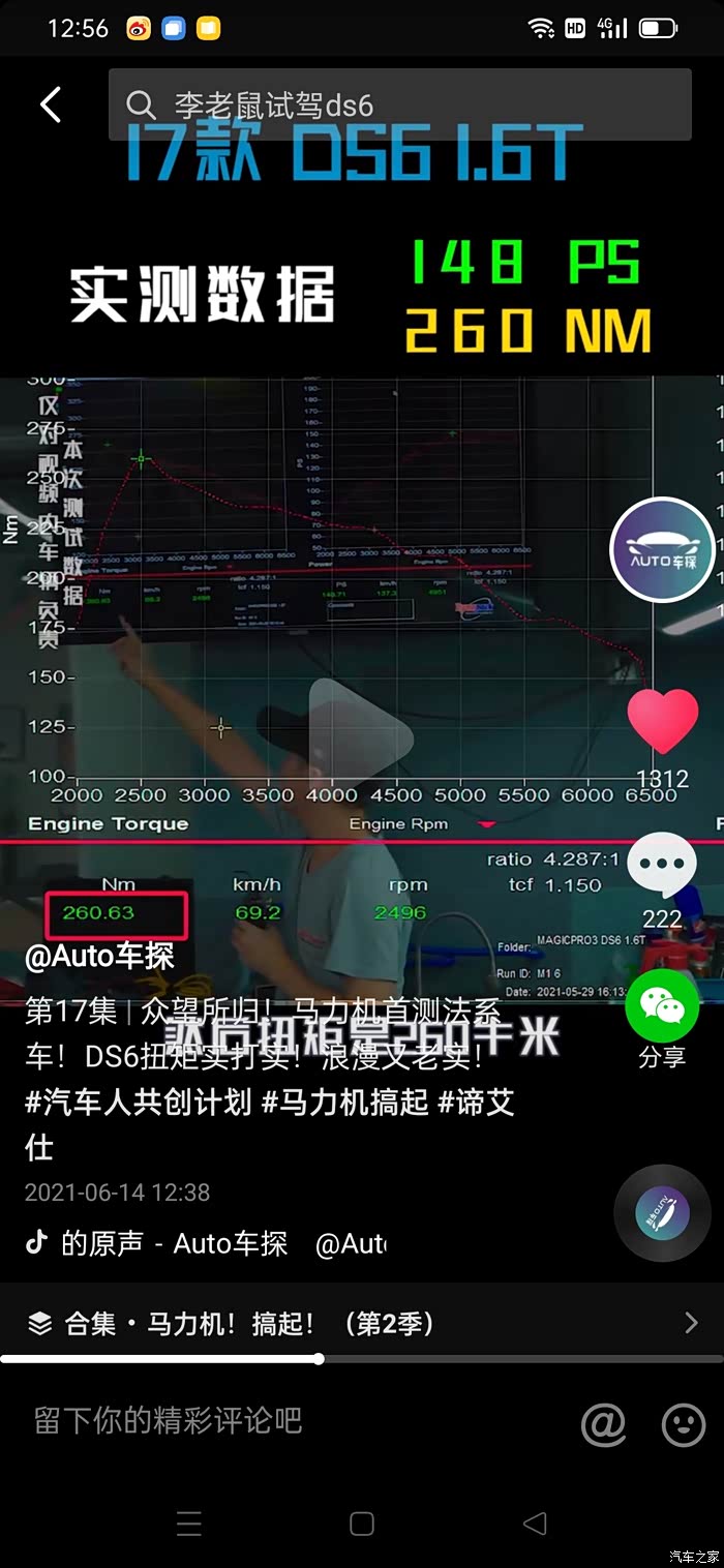 DS1.6T发动机轮上功率测试,最大扭矩260NM,对应转速2496转,而非1000转,对应车速69公里,而根据动力曲线图走向,1500转时候对应扭矩就是50NM左右,请问何来1000转涡轮介入呢!转速超过2500转后扭矩直线下滑,说明车辆已经没有后劲了。