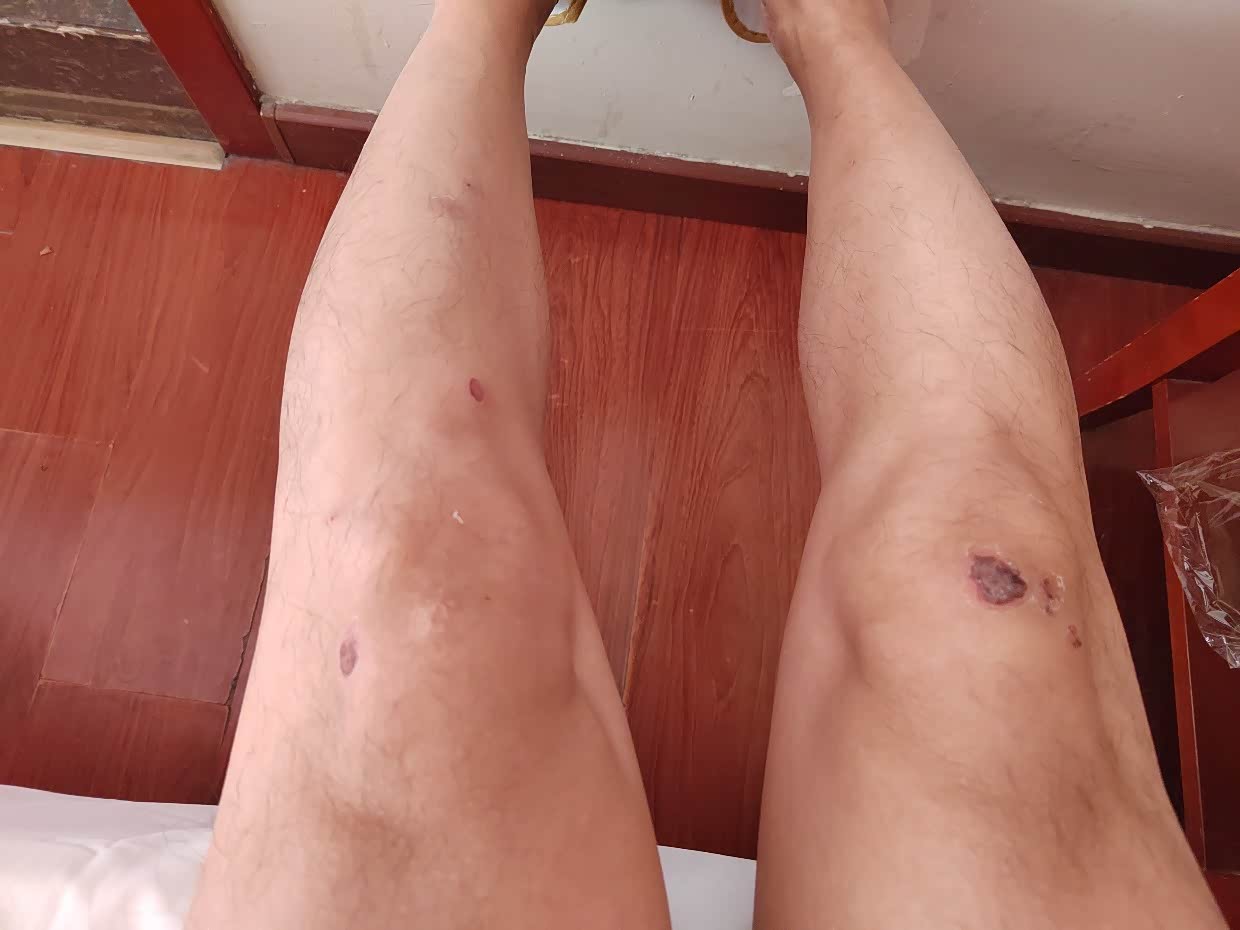 坐到路边,我感觉膝盖疼,撩开裤子,两个膝盖擦伤,左肩后部,擦伤,其他没事(护膝、骑行服、手套、头盔都穿戴整齐),路过的行人,纷纷拍照留念,我心想,谁TM还不是别人眼里的“风景”!