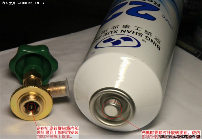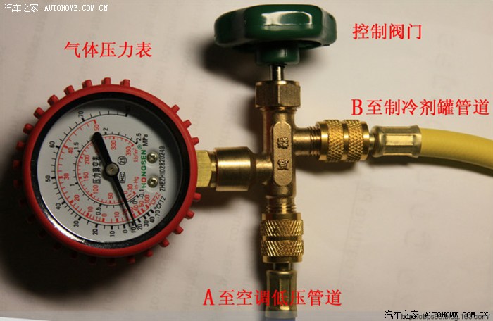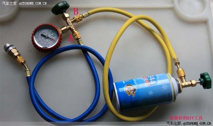 工具套装收到按示意图进行DIY加注补充工具组装。首先将气压表固定在阀门边,这个没得可选只有一个位置能将其拧上。将表面旋转到方便观看和操作的位置。阀门的下方接口(A)为至空调低压管,这个口与气压表一直连通。阀门中部的接口(B)为至制冷剂罐的接口。阀门主要控制A和B的断通。