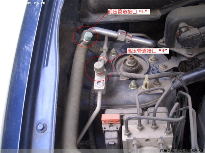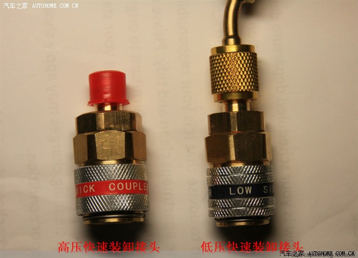 汽车空调系统在高、低压管路各设有一个外部接口,接口内部有自锁气门,平时用塑料盖帽保护起来。其主要作用就是调试和检测高、低压情况。从目前掌握的知识看小客车的这两种接口在标准上是统一的。高压接口略大,盖帽通常使用红色或标注H字样。低压接口较小,盖帽使用绿色或标注L字样。