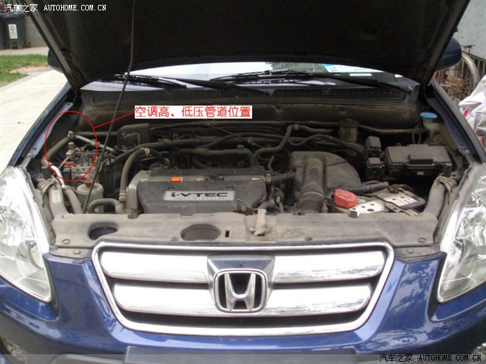 空调系统通常在发动机仓的左面。空调管道也无非两种。一是高压管路:就是压缩机的出口到冷凝散热器的一路,因为此时制冷剂已被压缩成液态所以又称为液路,通常这类管道较细温度也较高;二是低压管路:就是从毛细管到蒸发器的一路,因此时制冷剂在逐渐还原成气态所以又称为气路。此路管道较粗温度较低,通常有保温材料覆盖。