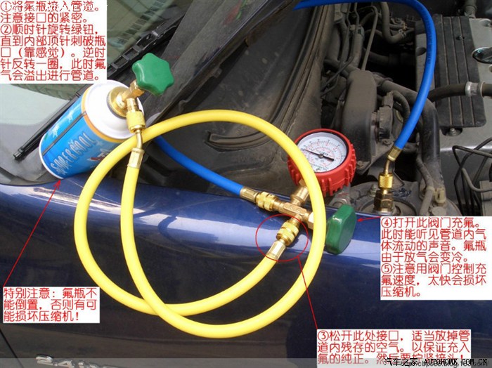 ⑥打开DIY加注补充工具阀门,向空调系统内充氟。此时能听见管道内气体流动的声音,手感R134a瓶由于放气会变冷。注意此时R134a氟瓶不能倒置。要用阀门大小来控制制冷剂的加注速度,不宜过快以防止发生"液击"而损坏压缩机。