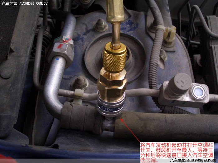 ①将汽车发动机起动并打开空调AC开关,排风扇开至最大,等待3分种后将DIY加注补充工具管子接口接入汽车空调低压端。