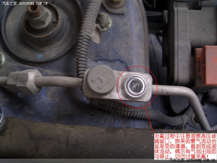 高压接口边还有一个玻璃窗口可以观察到管内液体流动情况。正是通过这个窗口我们能够初步判断空调内部制冷剂的存量情况,为维护提供参考依据。当然要准确的判断还是需要接上气压表,分别测量高、低压数值后才能做出。