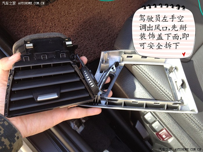 对于F30来说,无需拆除仪表台左侧方装饰板,也无需拆除大灯开关,甚至无需拆除驾驶员脚部左侧装饰板(就是预留后备箱开关孔位的那个装饰板)。总之,只拆一个左空调风口就特么对了!