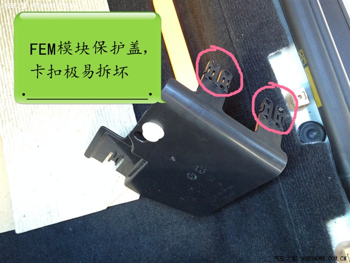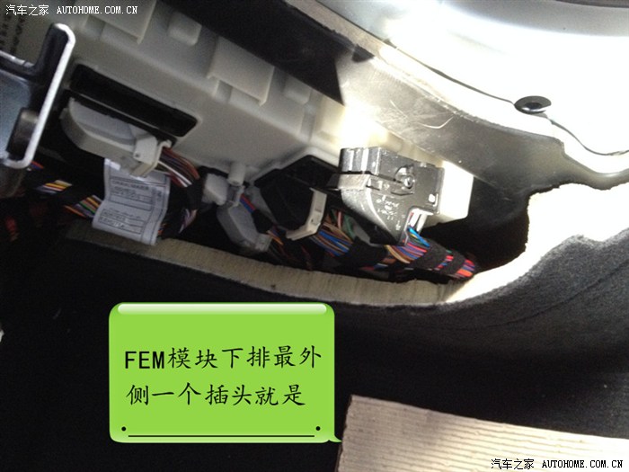 13、保护盖拆掉之后,就可以一睹FEM模块真容了。FEM模块是F代的新玩意。一个东西就取代了原来的JB、CAS、CA、FRM。下排最外面一个插头就是A173*2B了。拆下插头后,再把这个插头的外壳分离,直接把线插入空闲的37针孔即可。之后依次装回插头外壳,并重新连接插头到FEM。