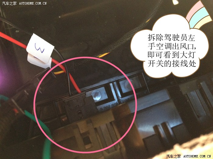 5、从空调风口伸手进去拔掉大灯开关的插头。我十分能理解空调风口那里角度很糟糕,你几乎没法直接看见这个插头。你看这个照片就明白了。大灯开关就这么一个插头,拔出来即可。(图片中已经是接完借电线路后的状态了,所以多了几个别的插头和线束,原车就画圈的那么一个,没跑!)