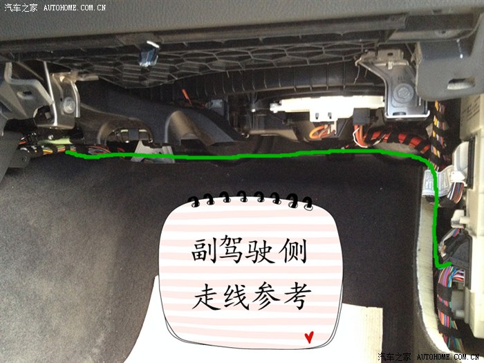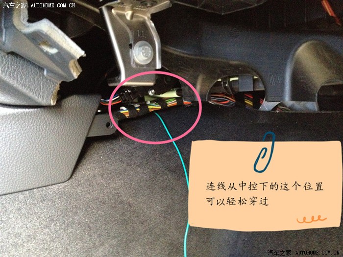 11、把开关线束上用于连接FEM模块的线,从中控下面穿过来。哥们我没找到铁丝,停车场里捡了一根羊肉串签子搞定了。