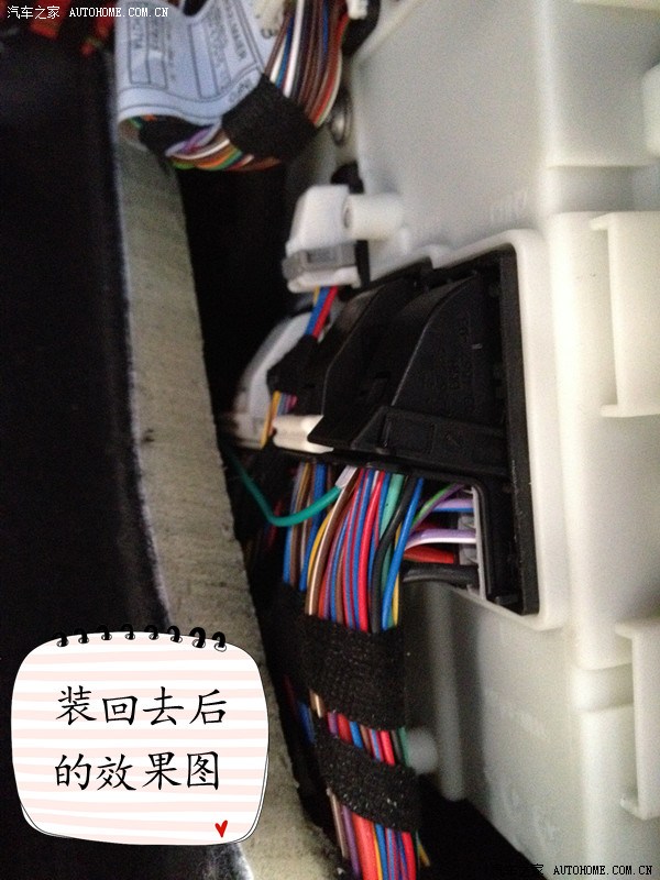 15、装回FEM保护盖,装回副驾驶脚部右侧装饰板(注意车门的胶条),装回副驾驶门槛饰条(参考步骤【9】),装回正副驾驶的脚部上方装饰板。总之就是把你刚才拆下来的东西都装回去,除了开关位置的挡板。