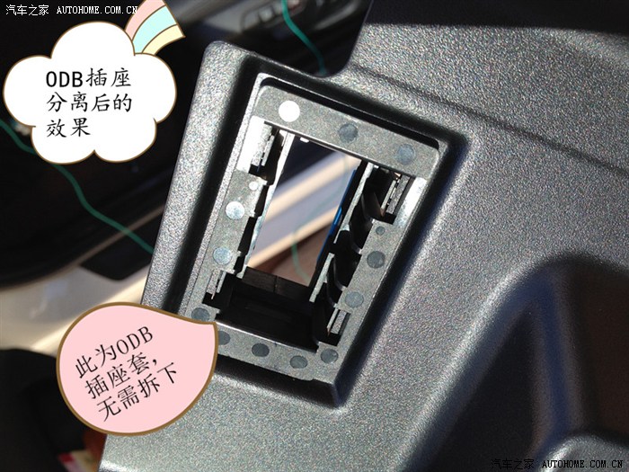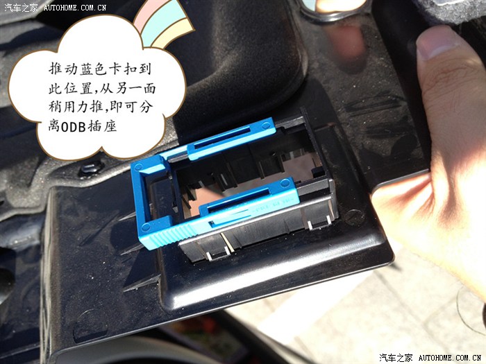 3、驾驶员侧脚部装饰板上连接着ODB插座,轻松推动蓝色锁止扣,然后从下方向上推出ODB插座。ODB插座套(有蓝色锁止扣的这个东西)无需从装饰板上拆下。
