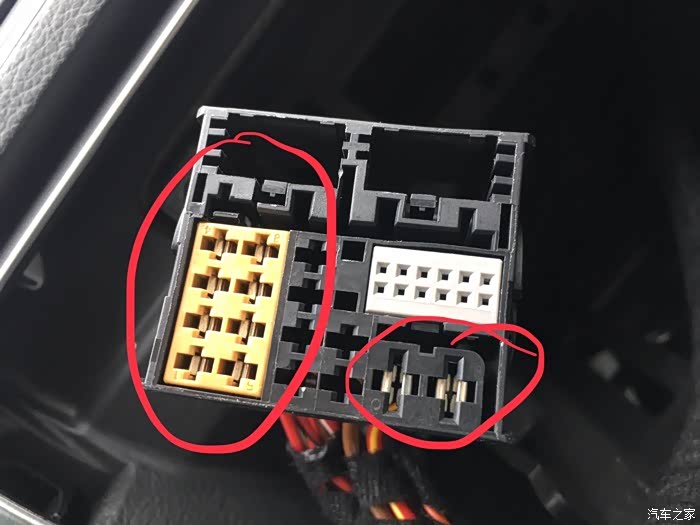 研究插口,无损安装,黄色为4路前后左右喇叭接口,还有两个是电源±