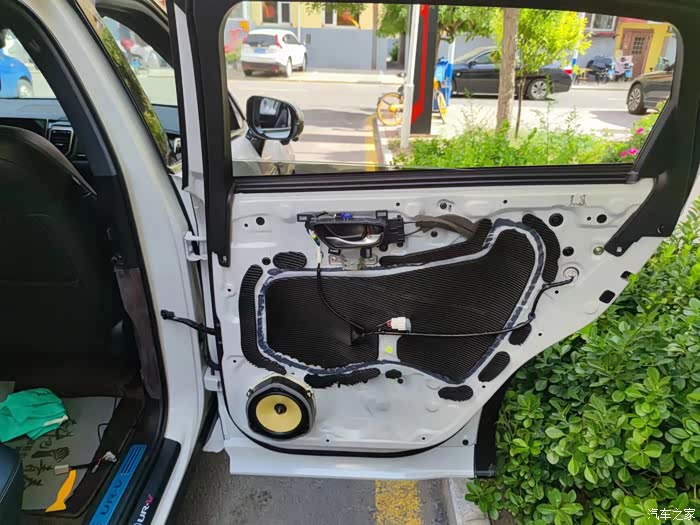 安装门板上的高音是最费劲的,忘拍一张图了,后门金属色塑料扶手装饰面板,用撬棒从最底部边缘打开,有一个螺丝拧下了,后门杯架位置有个小方块,撬开,有一个螺丝拧下来,后续就是拽,使劲拽,因为卡扣太多,也全是卡扣,大力出奇迹都下来了。(注意门板卡扣取下来以后,一定记得把门和门板之间的电源插口扒开,要不就拽断了)