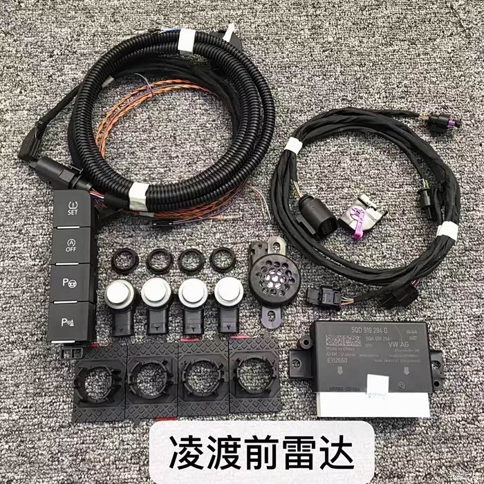 图中是凌度前雷达的材料:雷达模块一个,雷达支架4个,蜂鸣器1个 ,线束一套,雷达探头4个,雷达开关一个。
