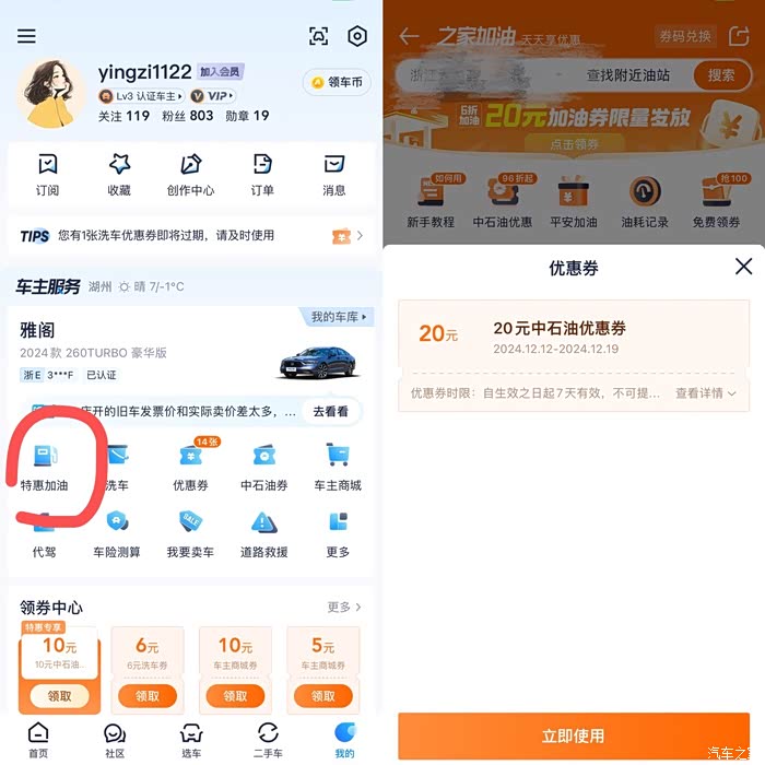 1.打开汽车之家APP“我的”主页面找到车主服务内的“特惠加油”,进去后会发现有很多加油优惠券可以领取,领取后再去指定的加油站加油,就会比较实惠了。但由于没有中石化站点,我就没去过。最重要的是不顺路,这是关键。