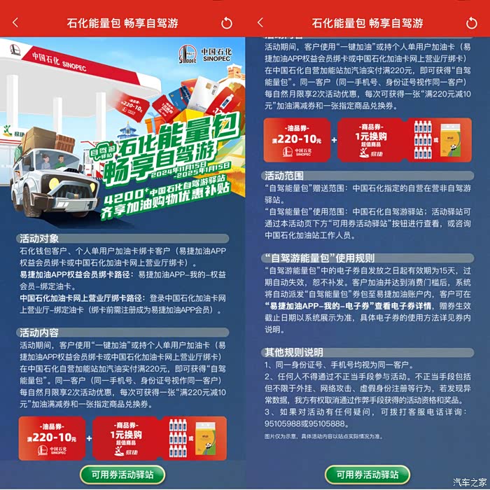 4.最后一个是近期中石化推广出的一个自驾能量包,在非自驾游的站点加油实付满220元,会送1张220-10元的优惠券,但这个券只能到指定的自驾游站点去用。有点复杂,觉得方便也是可以用用的。