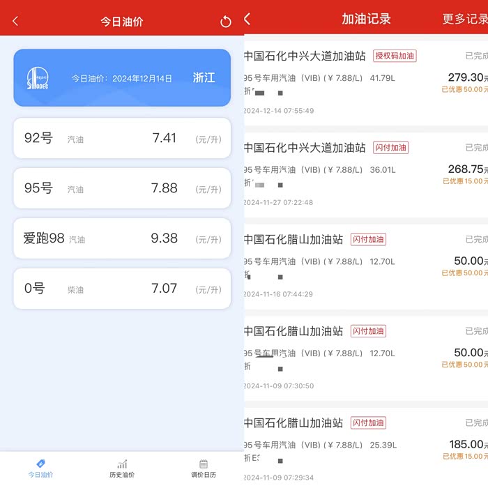 2.我是习惯了在中石化加油,站点多,顺路很方便,锋范加92号油,雅阁加95号油,平时也会经常看看优惠信息。中石化加油站基本是没有优惠的,偶尔交行信用卡能每月抢2次,以25元的价格购买50-25元的券。有一次在车友群别人发的链接活动领了几张中石化优惠券,加油抵扣。浙江省的油价普遍比较贵,能省一点是一点吧。