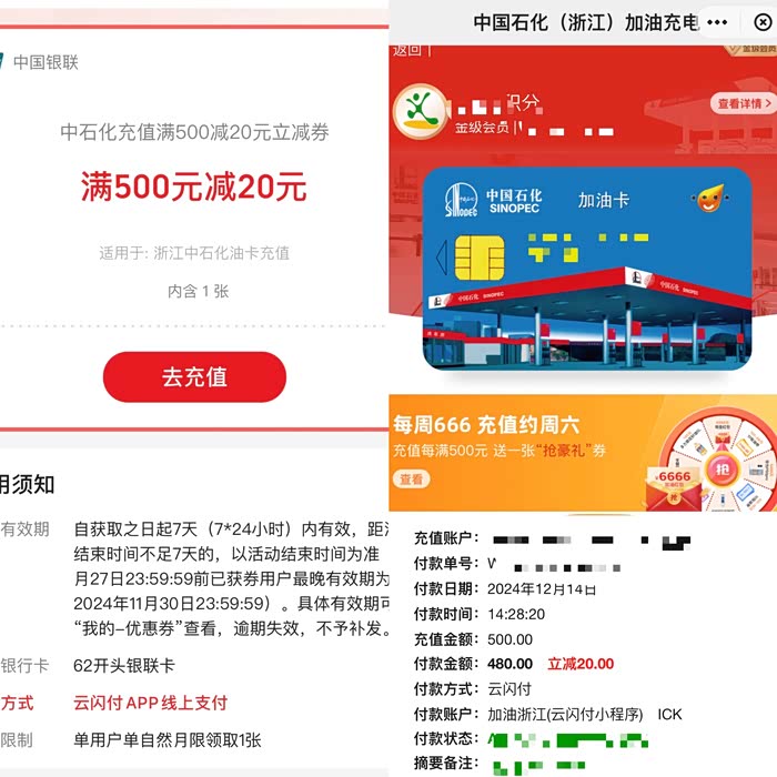 3.云闪付APP的“锦绣浙江优惠合集”里最近有中石化加油卡的充值满减券抢领,要看好时间,尽量早上进去领取,到下午基本就没了。如果是在周六领取充值后,还可以参加抽奖活动。