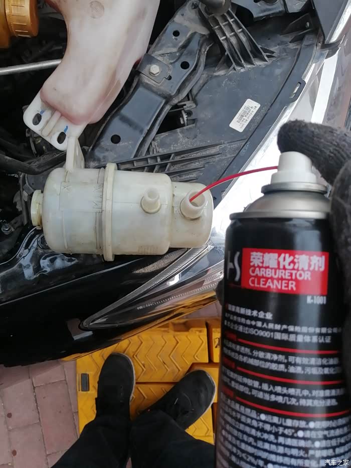 拆除助力泵的油壶,拆卸两个油管,空调管支架有点碍事,油管卡子不好弄,把防冻液储液罐拆掉,就3个螺丝很好拆,这样油管卡子就方便拆卸了。将油壶内的油液倒出来,将2根油管插到油壶上,油壶内加入干净的助力油,拧紧壶盖,启动车辆,挂1挡前进或后退均可,来回反复转动方向盘,左转方向盘到头,右转方向盘到头,此操作进行3—5次即可,停车熄火,将油壶内的油液倒出来,再加入新的油液,再去开车跑一圈,方向盘左右打满操作几次,停车熄火,将油壶拆下油液倒出来,油液清洗次数,视倒出来的油液干净程度而定,1-3次都行。