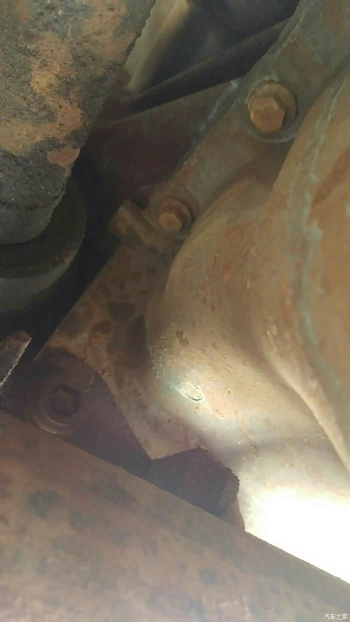 1.6老款帅客的三元催化器总共7颗螺丝固定,与排气岐管4颗,单独有一颗连接在波箱上,看上图