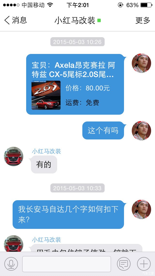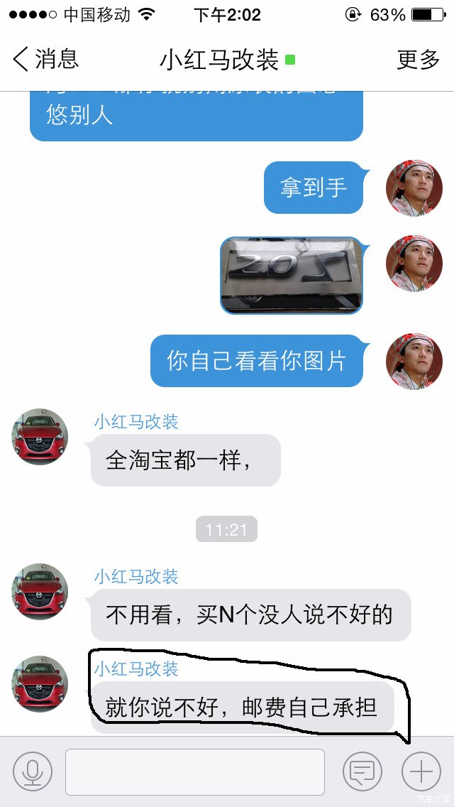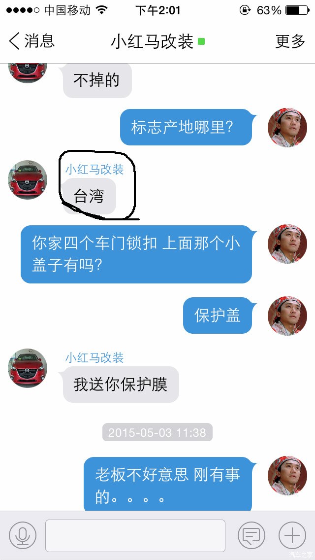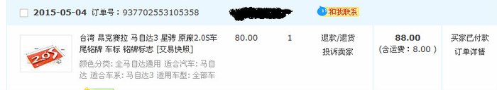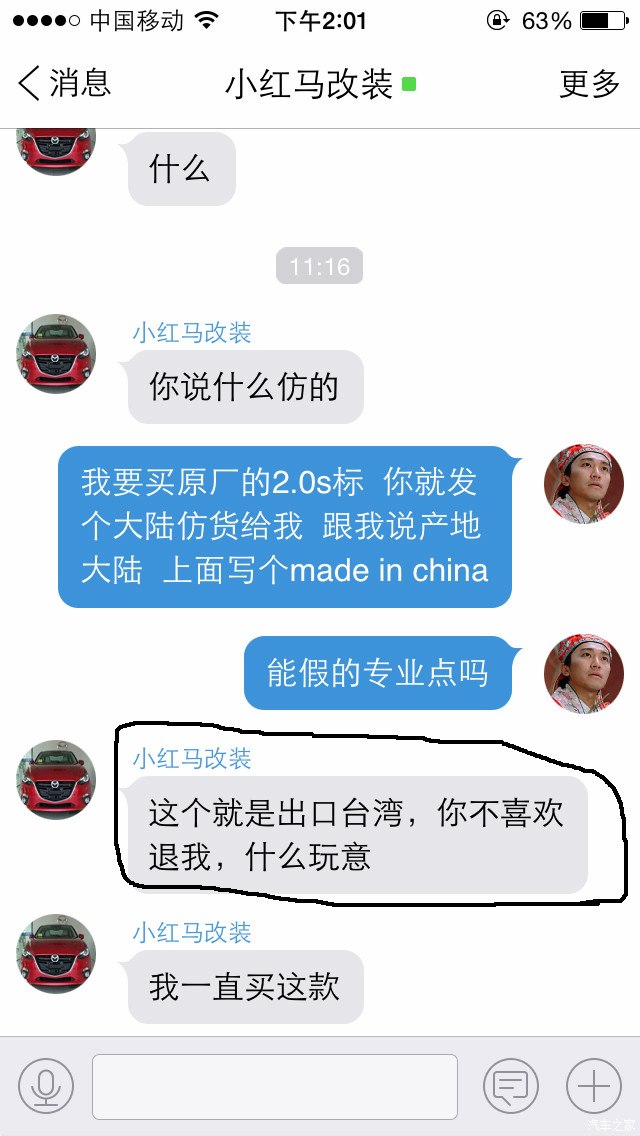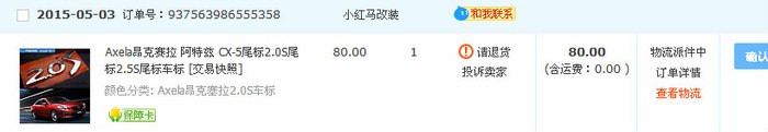 本人是昂克赛拉车友 因为想给小昂加个尾标 所以淘宝搜索 看到 小红马改装店铺 一个台湾产2.0s尾标 80元一个 价格不便宜 故询问老板 回答台湾产 我放心拍下 结果到手发现是大陆仿货 下面贴上交易记录以及聊天记录