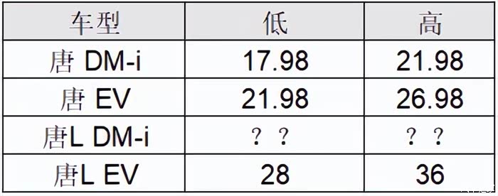 唐L DM-i(24-31万)比普通唐DM-i(17.98-21.98万)高约6-9万,与唐L EV比普通唐EV的涨幅(6-9万)一致。