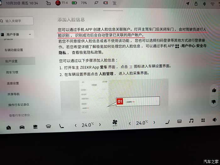 2、人脸信息无法同步至车辆。升级5.0系统后,每次上车关门时方向盘上面的摄像头会扫描人脸信息(扫描时仪表盘上会有相关的提示),自动切换账号和驾驶位置。印象中最开始录入人脸信息是在驾驶位上,面对方向盘上的摄像头进行操作。5.0后人脸信息录入整合到手机APP端操作,我老婆操作时总是在最后一步“同步至车辆”时提示“同步失败”。联系400后告知去售后对某些模块进行重载就能解决,结果昨天上午9店进店,直到晚上5点多,师傅在厂家指导下重载了多个模块都无法解决。最后不仅问题没解决,反而上车关门后,仪表上连扫描人脸信息的提示都没有了。最后师傅无奈告知等待下一个OTA应该可以解决。
