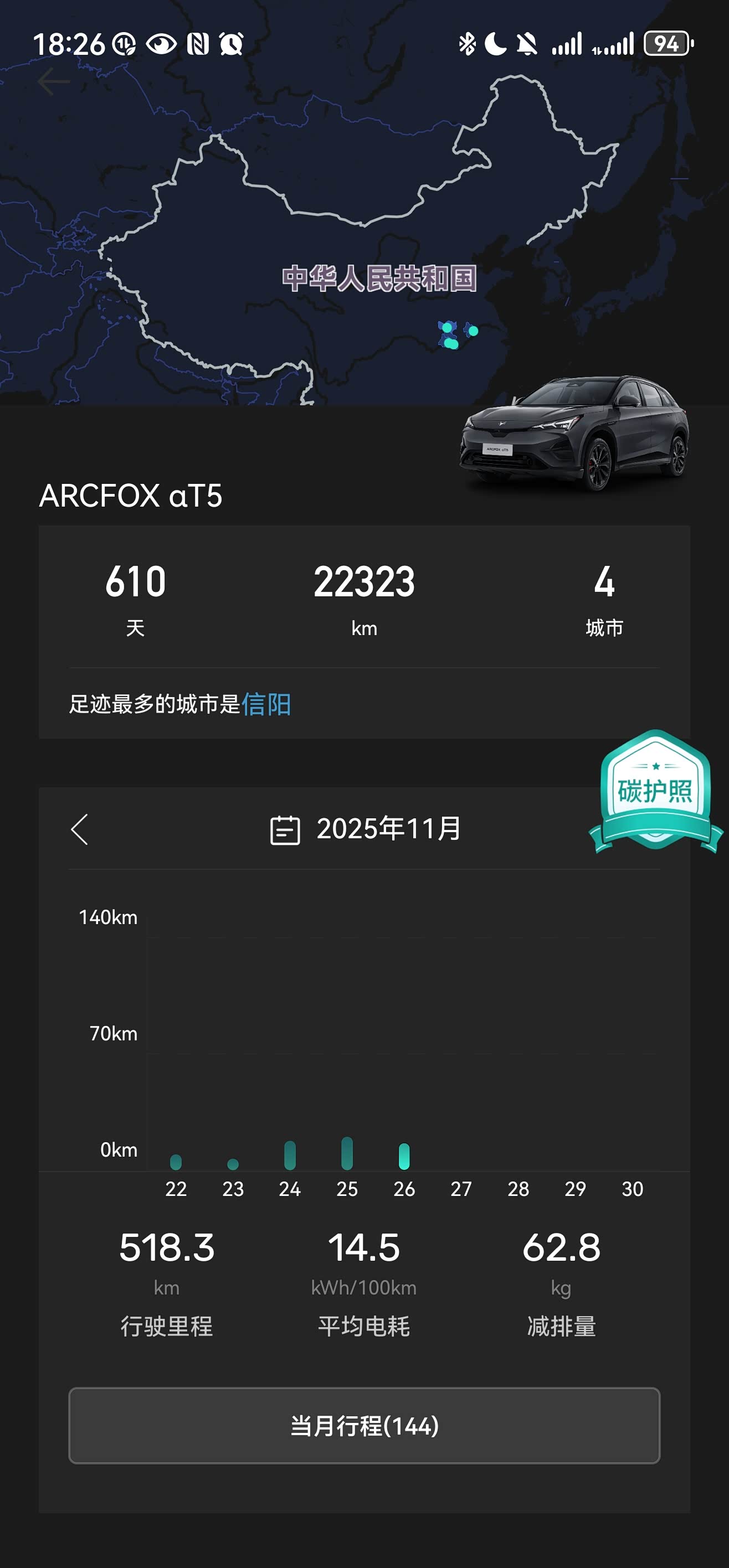 我的极狐阿尔法T5是2024款520Max版,2024年三月份提车,截止到今天,已经行驶了22323公里,目前平均电耗为14.5。