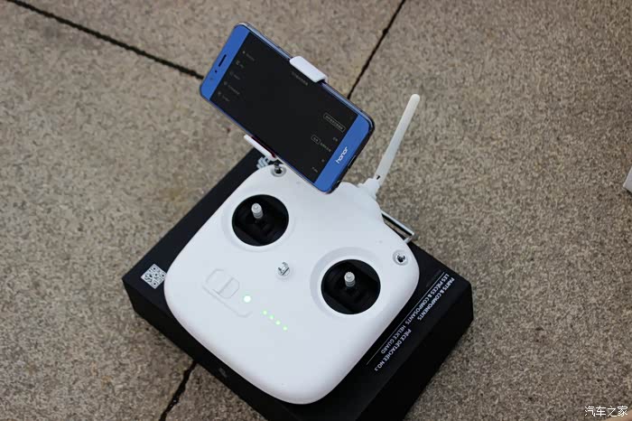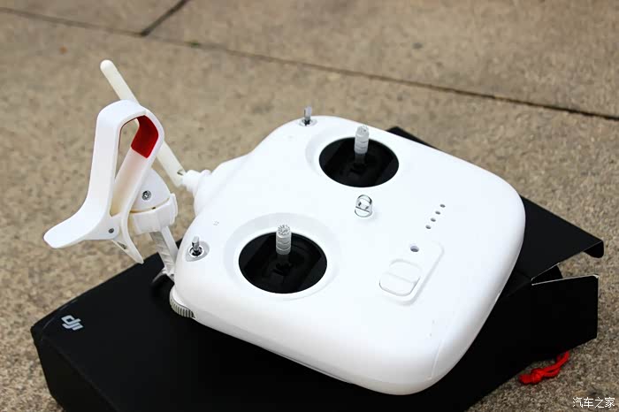 白色的控制台,感觉很容易搞脏呀。上手适应了一下左右控制杆,很灵活;左上方是固定手机的夹子;夹子左边是控制摄像头上下的滑轮;控制台前面是天线,可以随意控制角度;面板上面有两个飞行模式的拨杆(平时基本不会经常变动);最主要的就是控制无人机上下和前后左右,以及摄像机左右转动的两个主要拨杆;面板靠近身体部分则是开关和四颗电量显示灯。