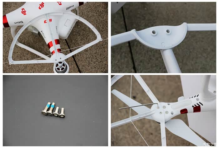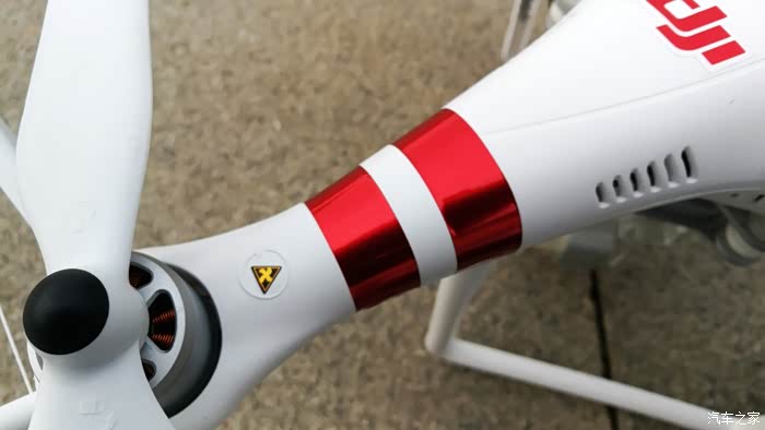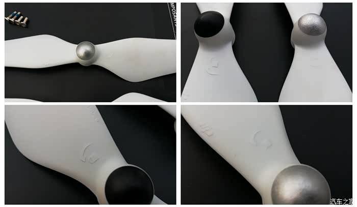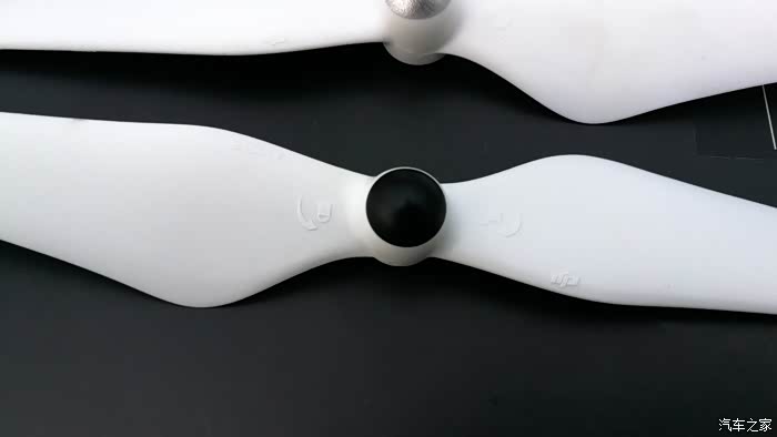 螺旋桨叶是非常关键的,桨叶中间圆帽顶部区分银黑两色,并在圆帽两边有安装和拆卸方向的指示箭头,边缘还有“dji”的标识。