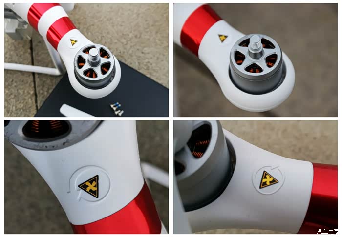 首先马达的顶部也有无黑点之分,分别对应相应的桨叶;另外在马达旁边会有明显得安装方向的箭头指示,跟桨叶相对应;四个马达呈对角线一致安装相同方向的桨叶。