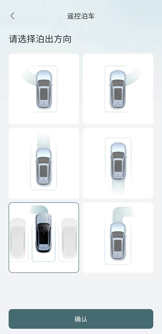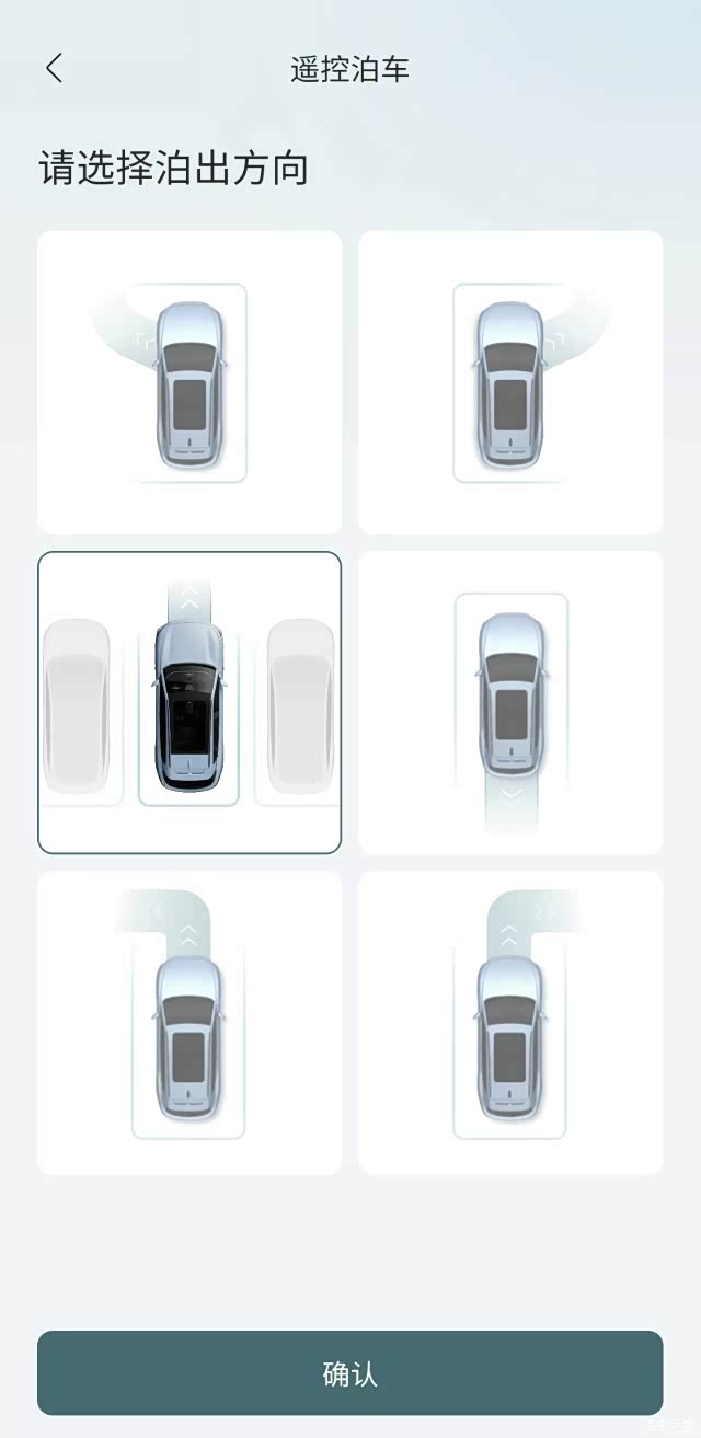 我觉得这个功能真心好用,现在外面停车环境简直乱七八糟,有这样的功能在停车方便多了,下面咱们再试一下自动开出车位的模式,前面的界面咱们跳过,直接在app最后的界面选择向哪边泊出;