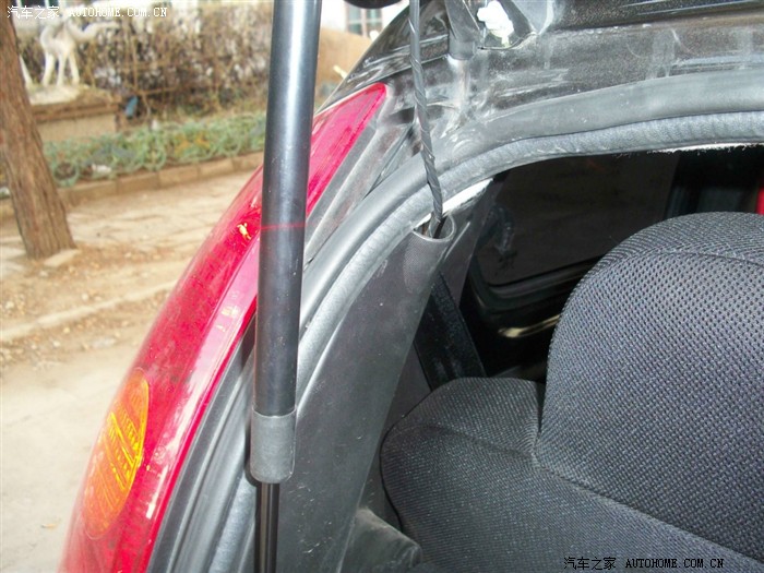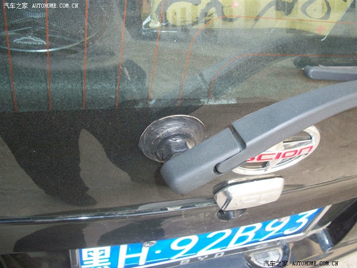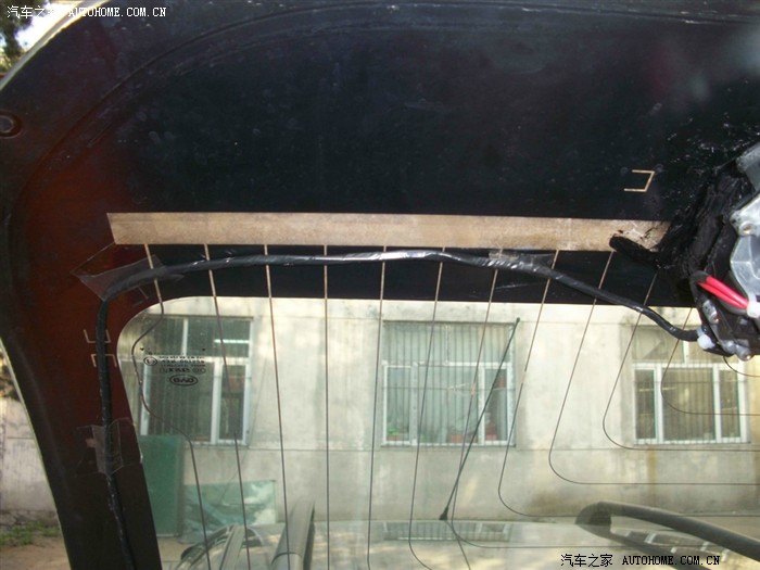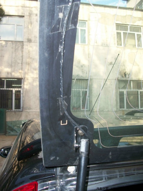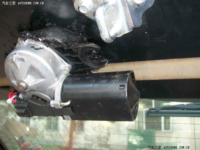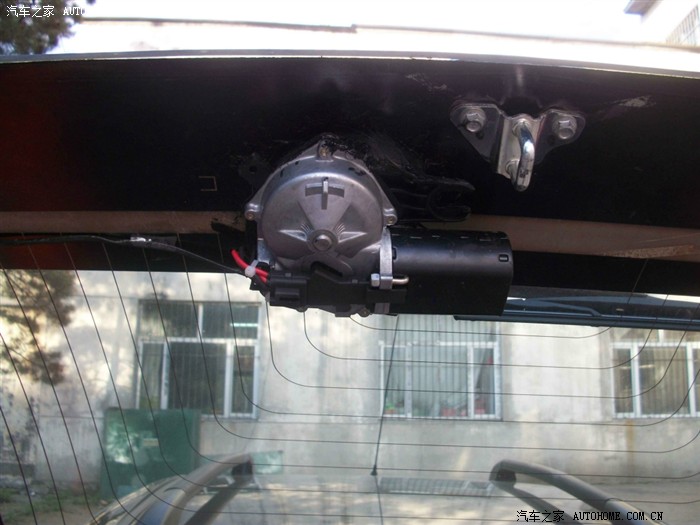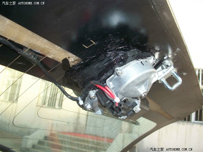 回来很修理店得哥们研究 最后只好找了一个铁螺丝从外面拧上,然后里面用一种黑色的玻璃胶一层一层的密封,最后虽然样子吓人 但是还是很结实,总体来讲 难点就是如何在玻璃上固定电机,原厂高配的电机一个是外面有塑料的螺丝盖固定 里面有一个后备箱锁哪个铁的开关上面延长出一块支架到雨刷电机上,起到固定作用,如果下次改的朋友建议在哪个后备箱锁上焊一个支架固定会比我的好一些,固定解决了下面就是接线了 修汽车电器的都会,还有就是走水管 换完喷水壶从前面到棚顶走水管 后面的高位刹车灯上有预留的喷水孔。