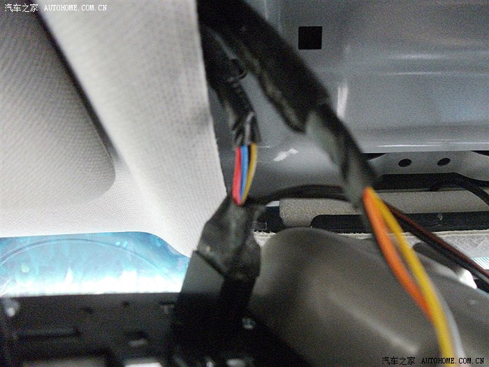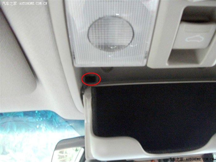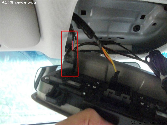 红框内为顶灯线插头处,此插头为白色(我用黑色绝缘胶布绑起来了),右边有一个黑色插头为天窗控制线。