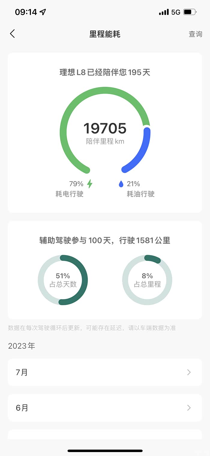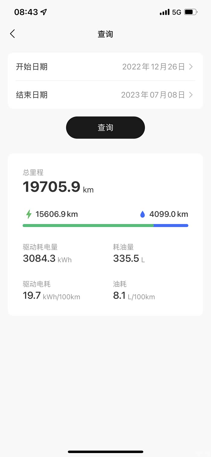 目前,行驶两万公里,驱动耗电量3084.3kwh,耗油量335.5L,驱动电耗19.7kwh/100km,油耗8.1L/100km。理想这车在市区和快速路(限速100)路段,我能做到1:1的能耗 ,表显充满175km,基本175没问题。在长途自驾,我基本会提前切换燃油优先或者混合模式(纯电通常在80%也就是还剩135km就会切换)。这样也不用担心亏电,因为我在路上跑得速度较快,又是夜间行驶(白天太堵车了)。