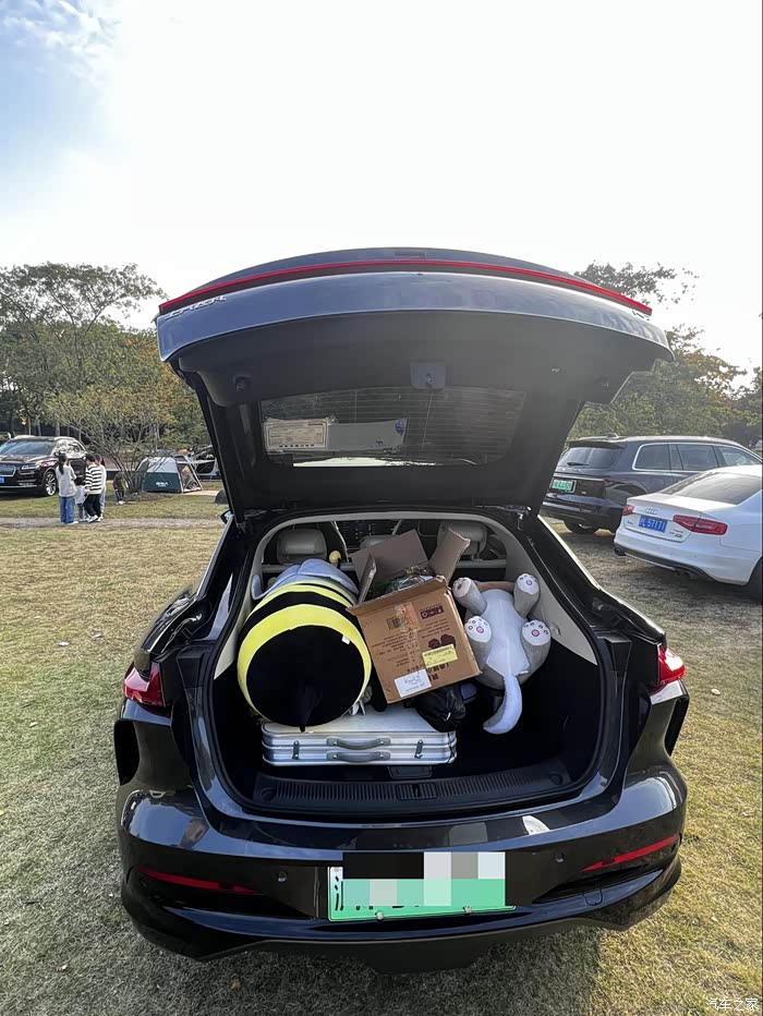 打开后备箱,拉着我们今天露营用到的各种“设备”,别看它是个溜背轿跑车型,但是后备箱的装载能力实在突出,比我朋友的本田CRV好太多了。