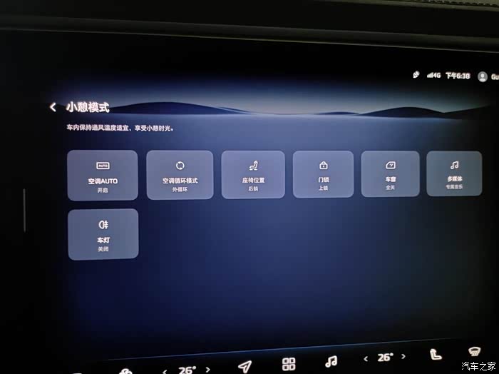 累了还能用大屏自带的爱奇艺,坐在车里追剧,开起一键大躺模式,在车里把车窗都关上,打开外循环,再加上它的立体音响,整个感觉还是非常不错的。