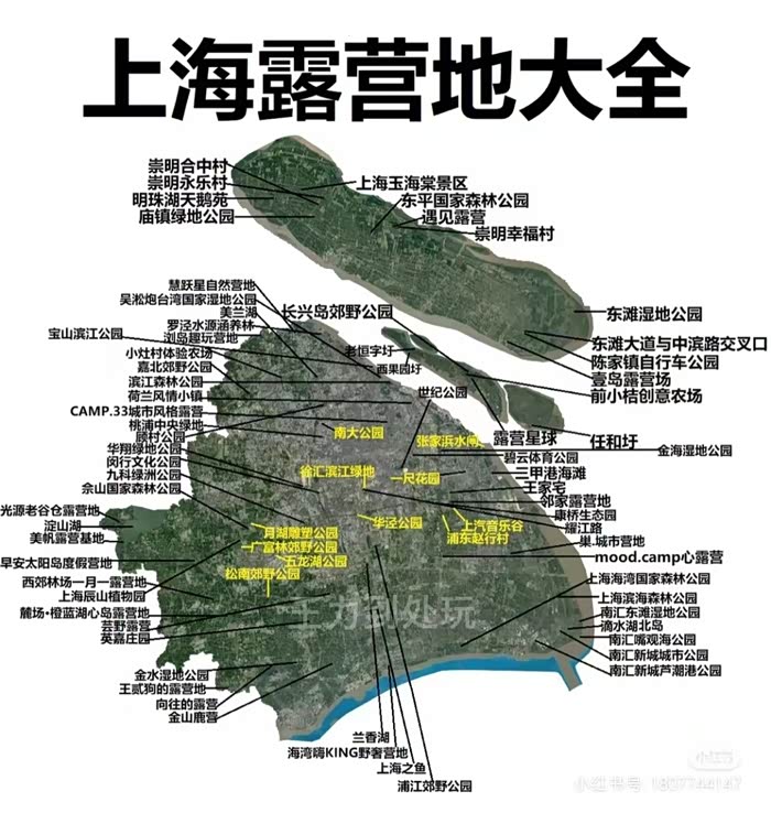 说到上海露营地,给大家贴一张分享图,也是从小红书看来的,都是比较不错的地方,那时候跟朋友们一起开着车也打卡了不少上海周边的露营景点,像闵行文化公园,长兴岛湿地公园,还有滴水湖等等,周末露营的人都很多。