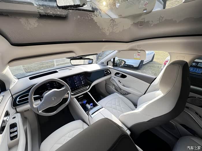白内+三联屏简直绝配!如果不考虑耐脏程度,选白内没毛病。R7的储物空间也是十分给力,除了内置两个杯架放上水瓶以后,还可以放许多杂物,整个内饰设计也是十分优雅和精致,豪华气息扑面而来。