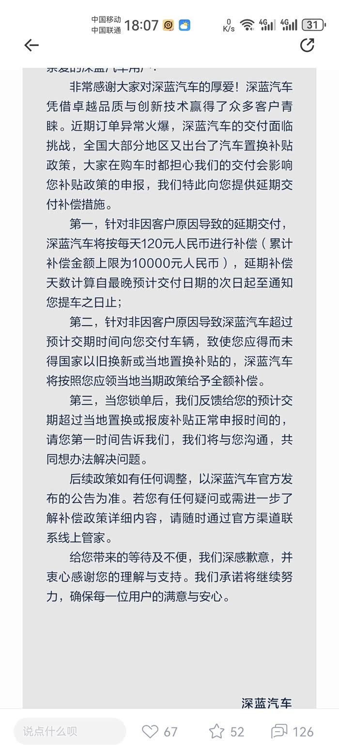 #深蓝S05新车主#当初有国补的时候就想换个新能源开,主要我的油车都10年了也想换车了。奈何没提前整个国三报废车。熄灭了我打算换车的想法,出来省补的汽车置换补贴,就去看车决定换车了,不能再错过了。已经37岁了有家庭生活压力也不小。预算10-13万的预算。只考虑纯电或增程。电芯首选宁德或弗迪的电芯。最先试驾的是元PLUS感觉气味太大了,可能内饰材料不够环保,那个内饰也太不在我都审美上面。极狐T5试驾也很满意。就是9月多去试驾的,当时天太热了,后背都出汗了。缺少了座椅通风 没电动遮阳帘。也没哨兵模式 行车记录仪。哪吒L各方面也很满意,纯电300公里冰箱大沙发。唉😔就是销量不好,传出欠薪,怕倒闭了。至于银河E5当时也盲订了看了发布会电芯不是宁德的就直接放弃了。正好看到深蓝S05看到是宁德的电芯就盲订了。20号看了发布纯电价钱还凑合,增程就有点一般了。21号早上就去试驾。试驾完之后感觉还不错,电耗11.8还可以。缺点后排中间的位置坐着不太舒服,凸出了那么一点点,为了后排放倒纯平牺牲的,没仪表盘虽然有HUD不过次顶配和顶配才有还不能选装。这点没银河E5地道。纠结选PLUS加舒享包还是MAX,只能说这次定价操刀太刁钻了。PLUS就算加包没仪表盘,只能选MAX了。最后选了510Max,选装了实体钥匙,预算有限就没选马牌轮胎了。就转大定等车中了,最好的是邓总承诺晚交付导致的没领到省补国补的深蓝补偿。算是吃了一颗定心丸。